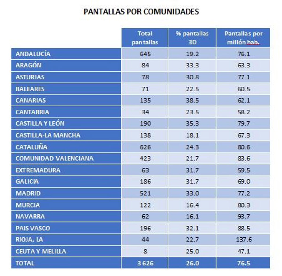 En España, existen aproximadamente 77 salas de cine por cada millón de habitantes, dos más que en la anterior entrega del censo, aunque cinco inferior a la cifra de hace diez años. Las comunidades que tienen 80 o más salas por millón de habitantes son: La Rioja (138), Navarra (94), País Vasco (89), Comunidad Valenciana (84), Cataluña (81) y Murcia (80).