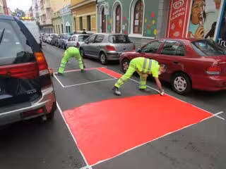 La concejal de Distrito Centro, María Amador, ha acudido este lunes a la calle Alfredo Calderón, en Alcaravaneras, donde una cuadrilla de operarios procedió al pintado de las señales viarias que determinan las puertas de entrada y salida de las Zonas 30.