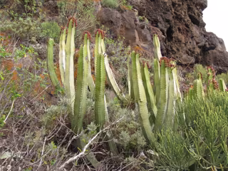 Aunque no se trata de un cactus, presenta un aspecto similar --altos tallos suculentos y espinosos--, que hace que esta planta sea una de las especies más fáciles de identificar de la flora canaria, recoge una nota del Jardín Botánico.