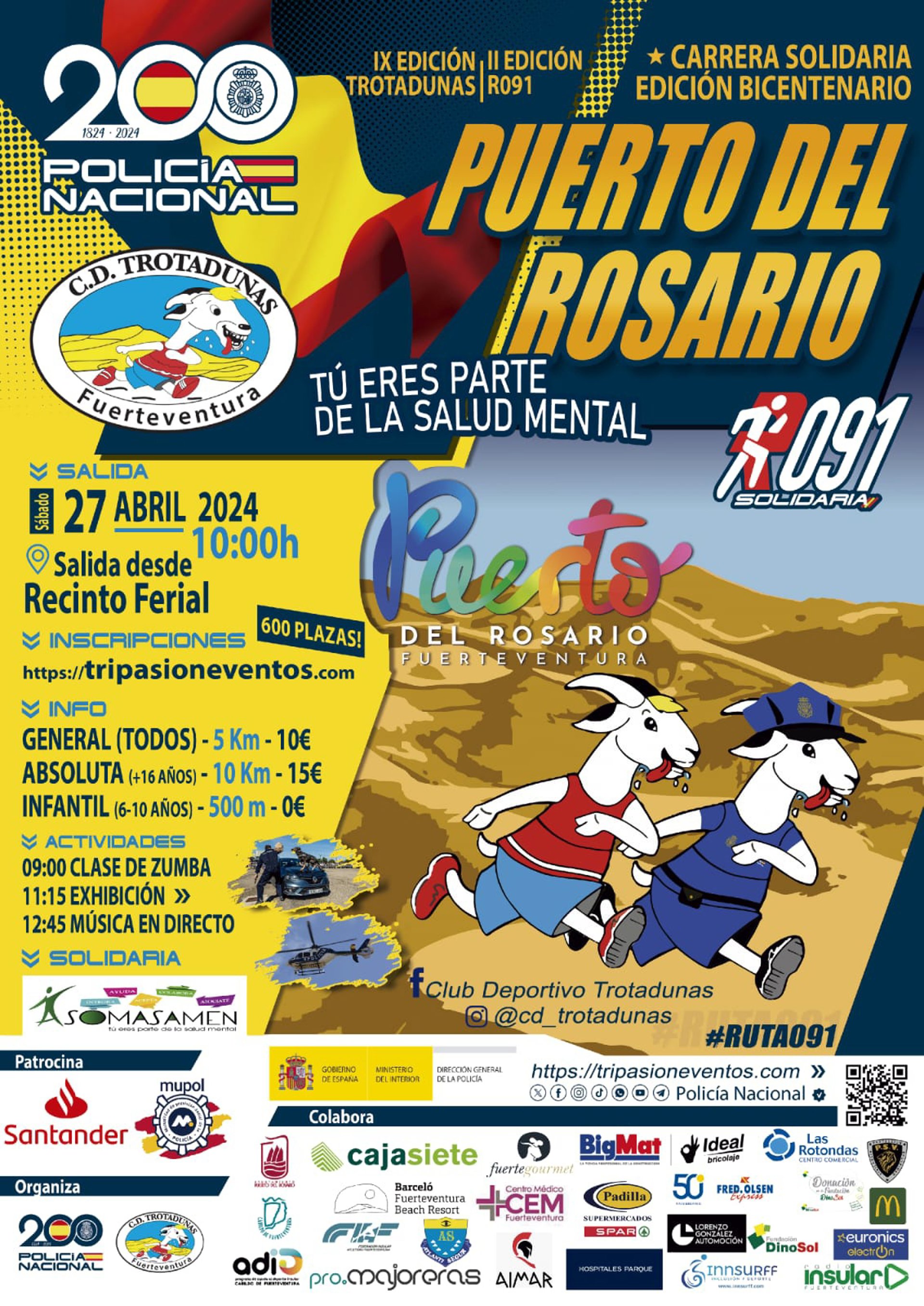 La Policía Nacional realizará la 2 Carrera Solidaria 'RUTA 091/ C.D. TROTADUNAS' en Puerto del Rosario, en la isla de Fuerteventura, el 27 de abril, que destina los beneficios a causas solidarias que ayudan a los más desfavorecidos, en esta ocasión a la Asociación Majorera por la Salud Mental ASOMASAMEN.