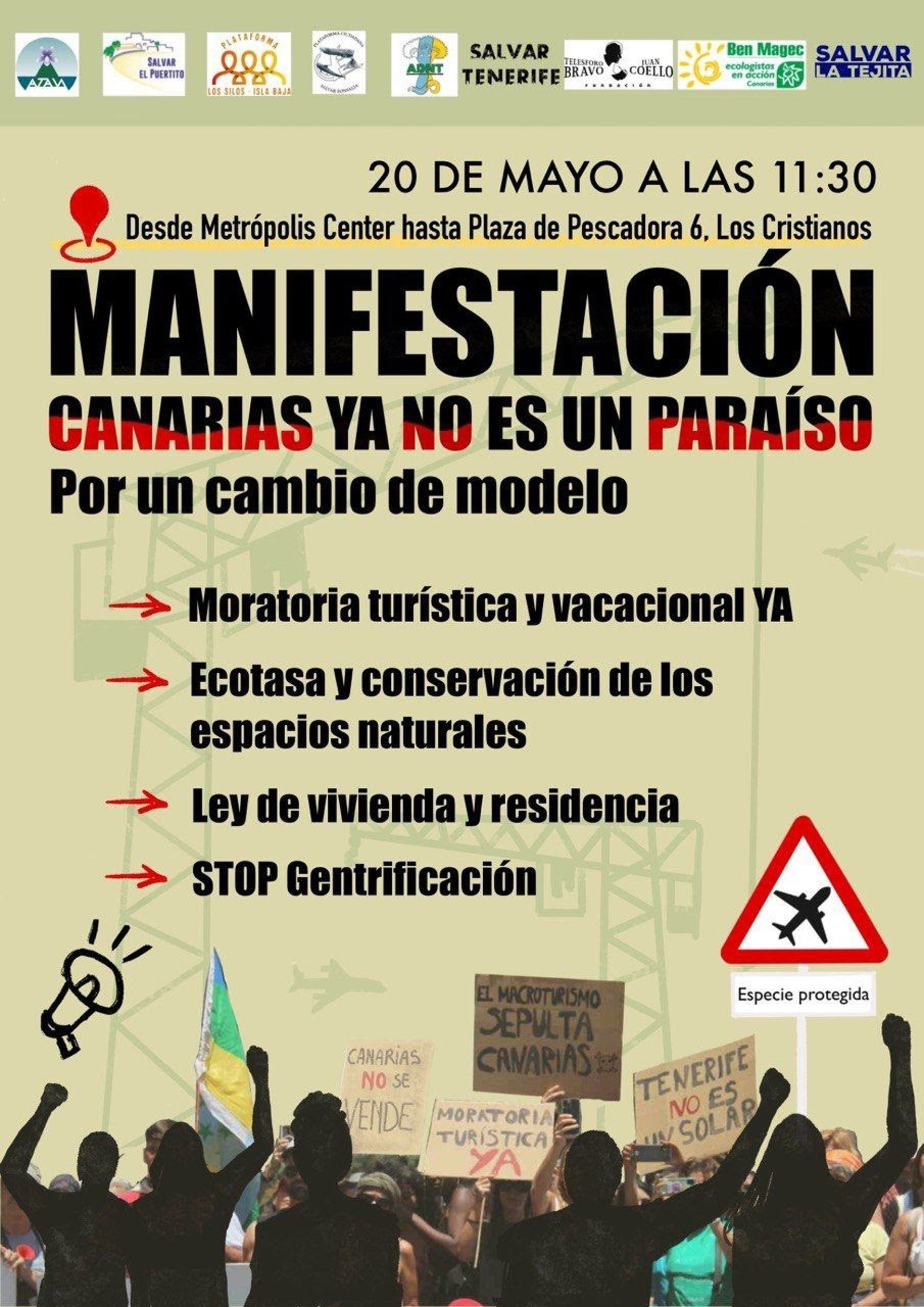 Bajo el lema 'Canarias ya no es un paraíso. Por un cambio de modelo', la marcha partirá desde las 11.30 horas del parking ubicado junto al Metrópolis para proseguir por el paseo costero hasta llegar a la plaza La Pescadora en Los Cristianos.