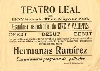 En este Programa, de 27 de mayo de 1916, se anuncia un espectáculo de cine y varietés de las Hermanas Ramírez, "de las bellísimas, encantadoras, jóvenes y celebradas duetistas a transformación, canzonetistas de original, selecto y muy numeroso repertorio absolutamente moral".