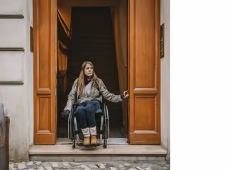 Mujer con discapacidad en un edficio no adaptado. - ELKARTEAN