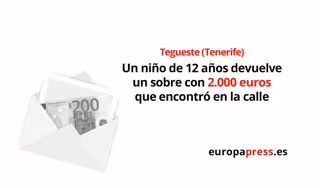 Un chico de Tegueste de 12 años encontró ayer en la Carretera General TF-13 un sobre que contenía 2.000 euros en billetes de 50 euros y lo llevó a la Policía Local de la Villa, que ya lo ha podido devolver a su dueño, un vecino del barrio de Pedro Álvarez.