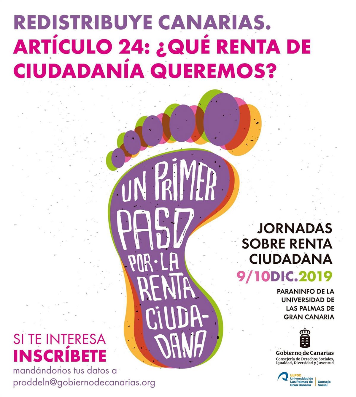 Con el fin de dar a conocer las principios y objetivos el proyecto de ley regulador de la Renta Ciudadana, así como recoger sugerencias, observaciones y propuestas sobre la misma, la Consejería ha organizado unas jornadas específicas que bajo el título 'Redistribuye Canarias. Artículo 24: ¿qué Renta de Ciudadanía queremos?', tendrán lugar el 9 y 10 de diciembre en el Paraninfo de la Universidad de Las Palmas de Gran Canaria.
