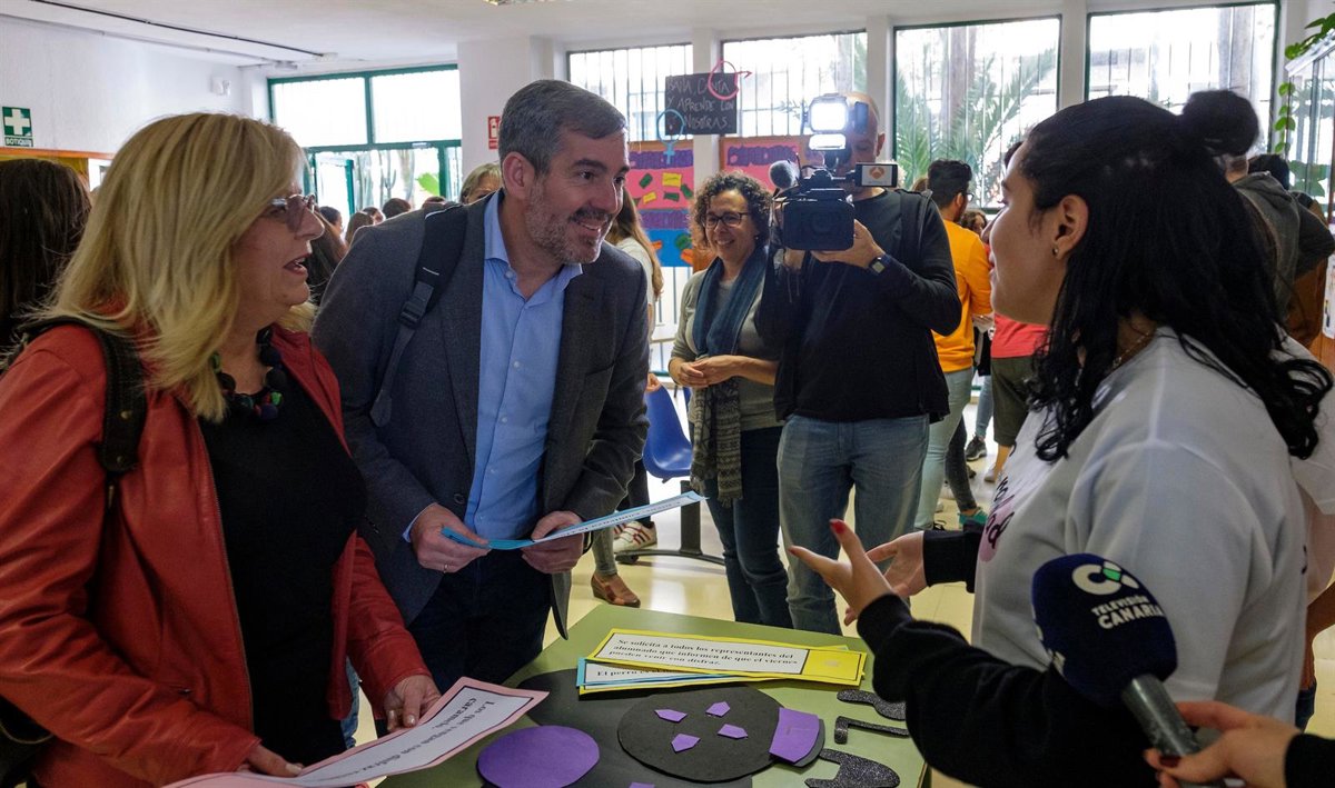El presidente del Gobierno, acompañado por la directora de la Agencia Canaria de Calidad Universitaria y Evaluación Educativa (ACCUEE) y del Servicio de Innovación Educativa, Teresa Acosta, y por el director general de Formación Profesional y Educación de Adultos de la Consejería de Educación y Universidades, Manuel Jorge, pudo presenciar un circuito de actividades sobre acciones de sensibilización acerca del uso del lenguaje inclusivo, preparado por el alumnado de primer curso de este Ciclo en el marco del módulo 'Información y Comunicación con perspectiva de Género', así como conocer el proceso formativo del citado ciclo --que tiene un enfoque eminentemente práctico y preventivo--, a través de un vídeo a cargo de los estudiantes de segundo curso.