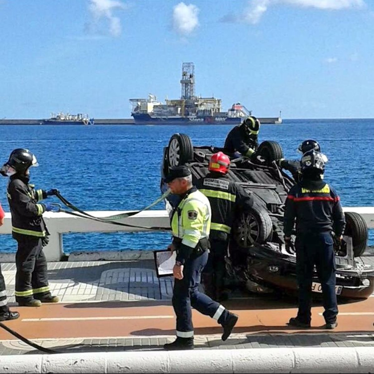 Un vehículo quedó volcado durante la mañana de este martes en el paseo de la Avenida Marítima de Las Palmas de Gran Canaria tras salirse de la vía cuando circulaba dirección norte por la autovía.