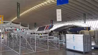 Las gradas que acogerán al público de las galas y concursos y la estructura que soportará la decoración son los primeros elementos que están colocando los técnicos dentro del edificio, que permanecerá cerrado al público hasta el 1 de febrero, fecha en la que se celebrará la primera fase del concurso de murgas infantiles.