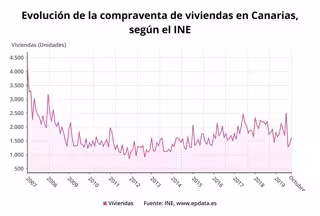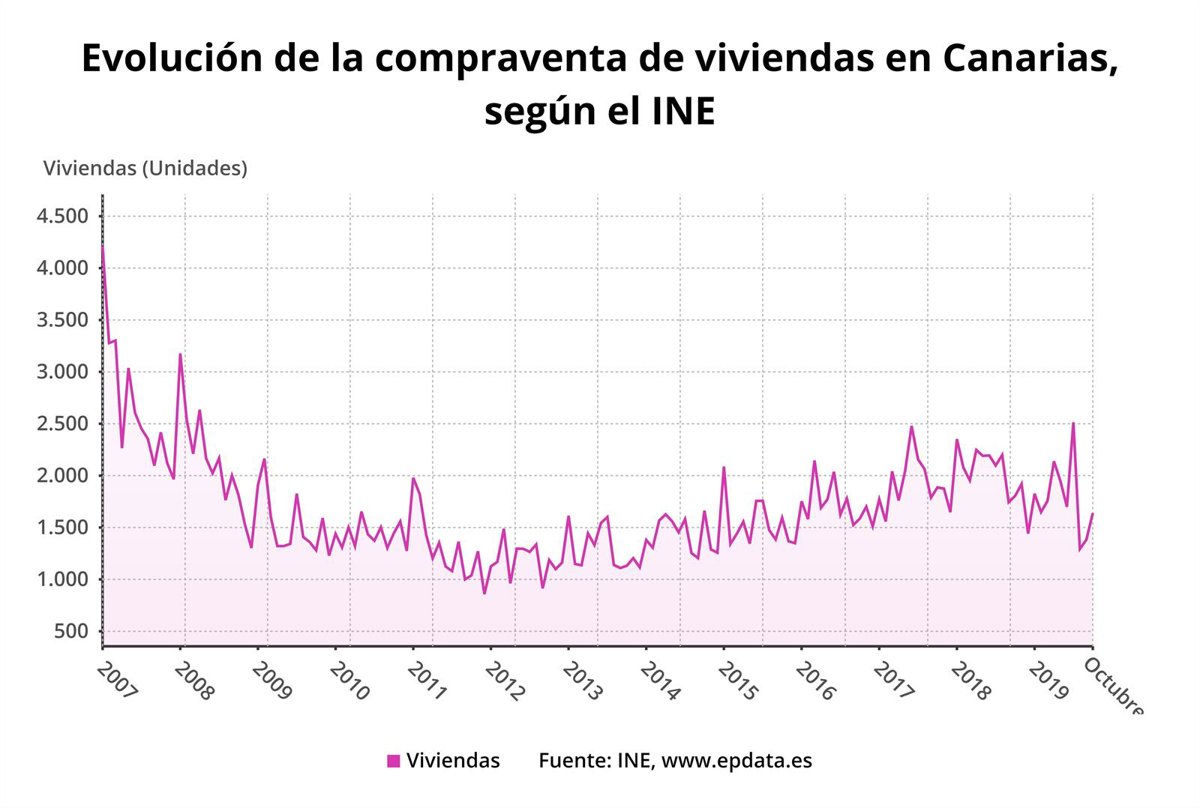 La compraventa de viviendas bajó un 1,5 por ciento en octubre en relación al mismo mes de 2018, hasta sumar 42.825 operaciones, en el caso de Canarias esa caída fue de un 9,2 por ciento, siendo una de las comunidades que más retrocede, según ha informado este viernes el Instituto Nacional de Estadística (INE).