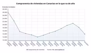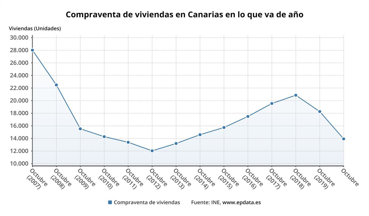 La compraventa de viviendas en Canarias ha descendido un 19 por ciento en octubre con respecto al mismo mes de 2019 al alcanzar 1.363 operaciones, según ha informado este martes el Instituto Nacional de Estadística (INE).