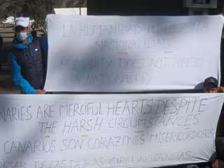 Aprovechando la visita de la eurodiputada de Unidas Podemos Sira Rego, una parte de la treintena de migrantes magrebíes que ha abandonado el campamento y duerme por fuera, en el bosque de eucaliptos, han exhibido pancartas con lemas como "La humanidad no necesita solidaridad", "el migrante es un ave que ama viajar y no vive en jaulas" o "los canarios son corazones misericordiosos a pesar de las duras circusntancias".