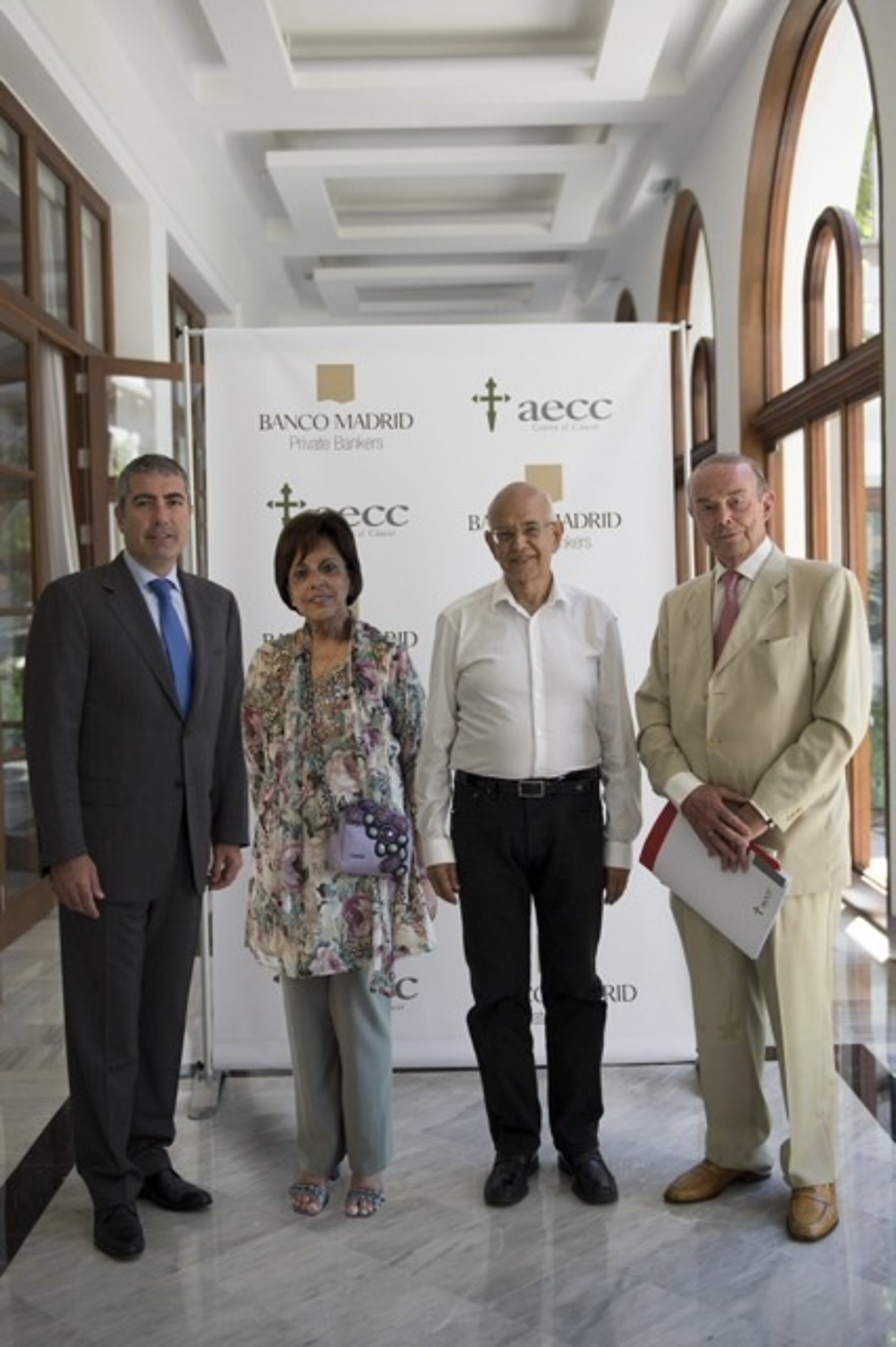 El inversor Ram Bhavnani, el presidente provincial de la Asociación Española Contra el Cáncer (AECC), Juan Julio Fernández, y el consejero delegado de Banco Madrid, Joan Pau Miquel, han firmado esta tarde un acuerdo de colaboración por el que se crea la Beca Familia Bhavnani para la investigación oncológica infantil.