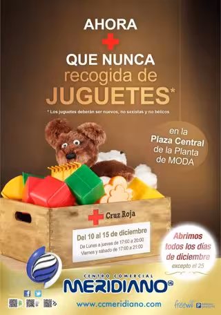 Hasta el próximo sábado 15 de diciembre, en horario de 17.00 a 20.00 horas, excepto el viernes y sábado que se amplía a 21.00 horas, habrá un gran número de voluntarios en la plaza central de la Planta de Moda del Centro Comercial Meridiano facilitando la recogida de las donaciones de regalos para los más pequeños. De este modo, cualquiera que lo desee podrá hacer su aportación con juguetes nuevos, no sexistas y no bélicos, respetando así el desarrollo integral de estos menores.