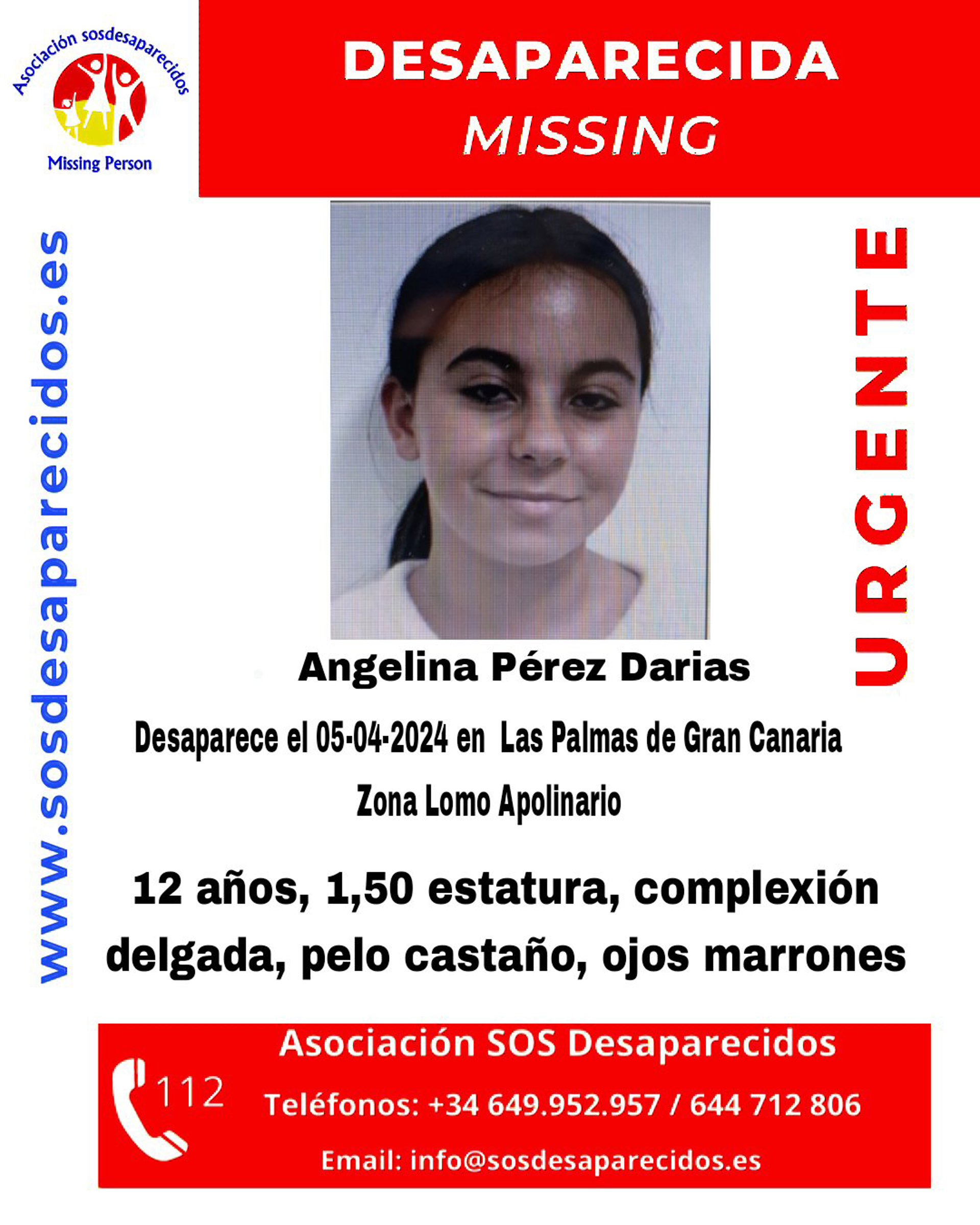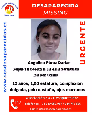 Angelina Pérez Darias, de 12 años, lleva desaparecida en Las Palmas de Gran Canaria desde el 5 de abril de 2024, cuando tenía que haber regresado al centro de menores en el que se encontraba, según la alerta lanzada por SOS Desaparecido y fuentes policiales consultadas por Europa Press.