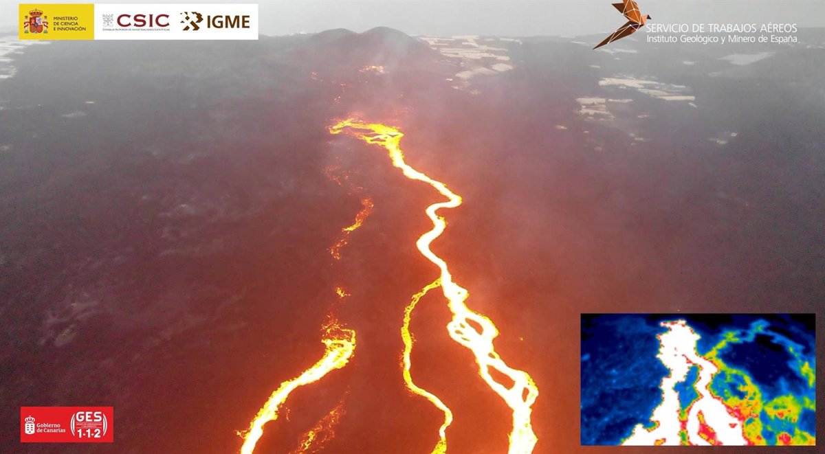 Asimismo, las grietas y fracturas observadas en días pasados en la parte superior del cono secundario se mantienen sin cambios o con modificaciones significativas, mientras la lava discurre mayoritariamente por el sector central de las coladas a través de tubos lávicos preexistentes, que van ganando terreno en dirección sur y oeste.