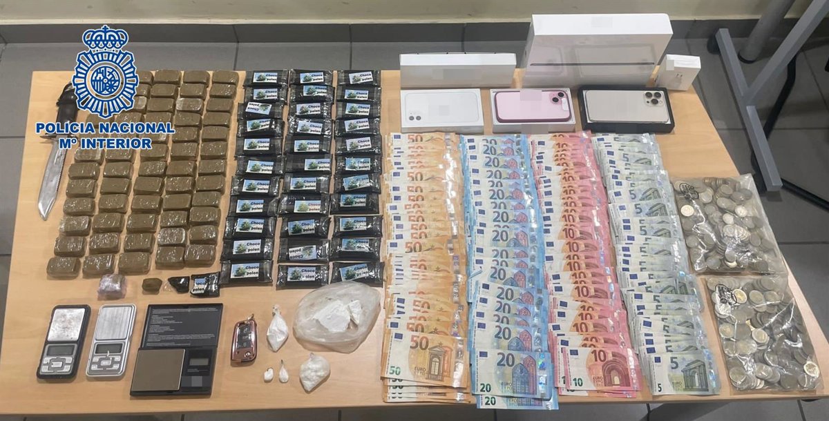 En los registros, fueron incautados 111 gramos de cocaína, 1.600 gramos de hachís, 1.500 gramos de polen de hachís, más de 6.000 euros en efectivo, varios teléfonos móviles, tres básculas de precisión, un puñal y un coche.