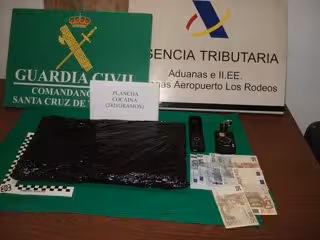 El joven fue abordado por los agentes en la sala de llegadas de Los Rodeos, en los controles fiscales que realiza la Guardia Civil. Tras hacerle un reconocimiento de la maleta, la Benemérita detectó en ella un doble fondo con una plancha escondida envuelta en plástico negro que contenía 2.421 gramos de cocaína.