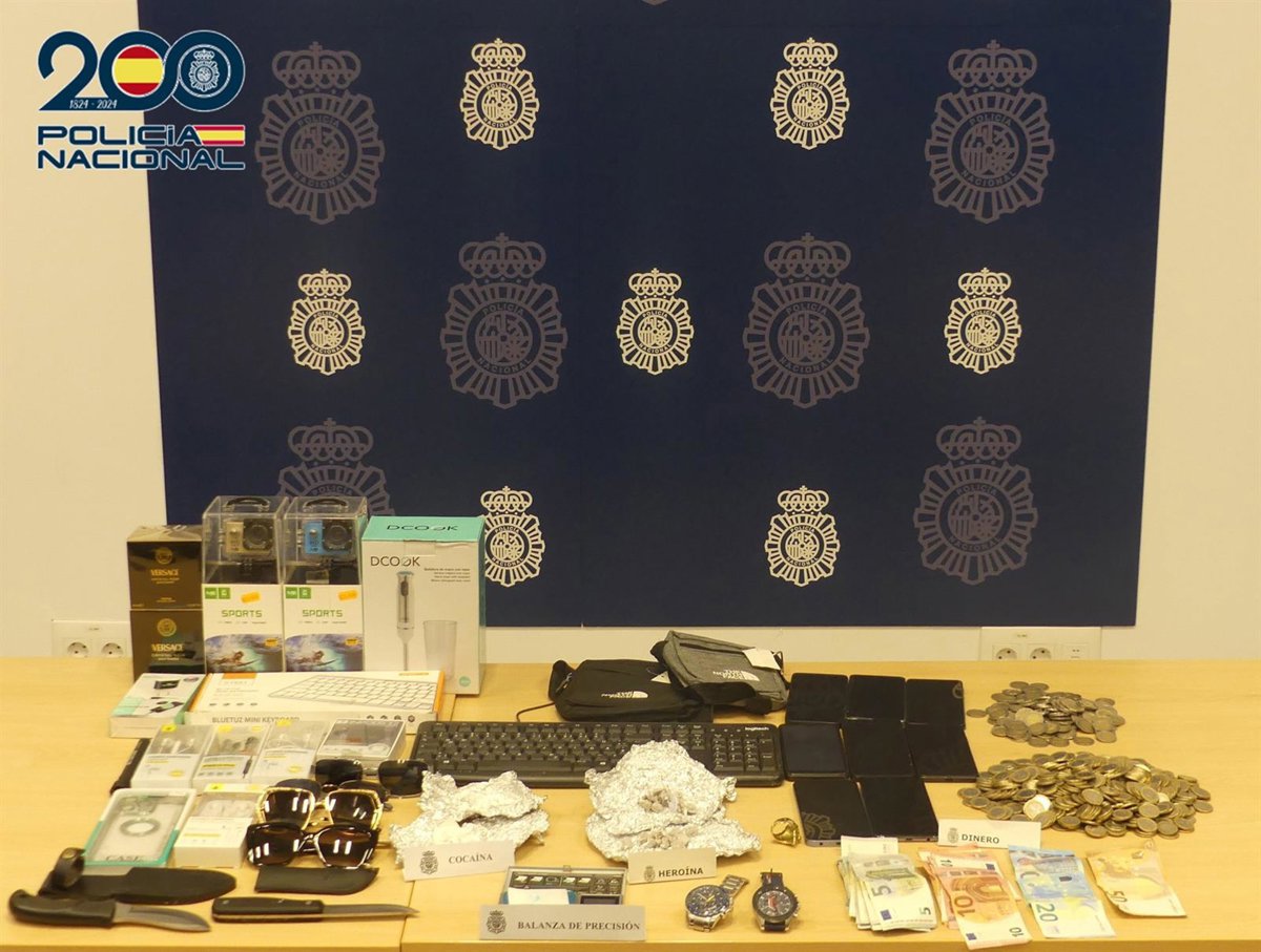 Ante tales hechos, se procedió a la entrada y registro de la vivienda, considerada como el principal punto de venta de drogas de la zona, dando como resultado la incautación de 9,81 gramos de cocaína, 9,26 gramos de heroína, 1.293 euros en efectivo, además de diversos efectos relacionados con actividades ilícitas anteriores.