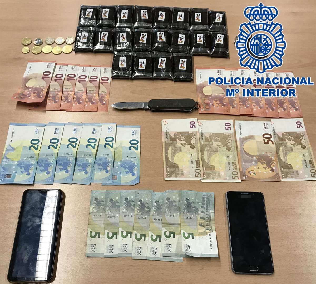 Durante el registro del vehículo fueron localizadas una navaja y veinte pastillas de hachís, de un kilo en total, ocultas bajo uno de los asientos, por lo que los dos hombres fueron detenidos como presuntos autores de un delito contra la salud pública. Instruido el correspondiente atestado policial, los detenidos fueron puestos a disposición de la Autoridad Judicial competente.