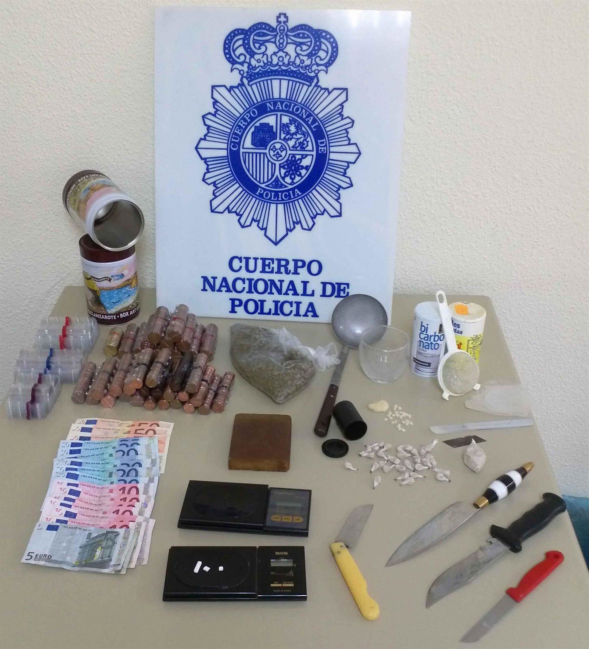 Además, intervinieron 25 gramos de marihuana, 95 gramos de hachís y varias dosis de trankimazín, dos balanzas de precisión y dinero fraccionado, unos 500 euros. También en una de las viviendas se localizó, en la cocina, los útiles necesarios para la elaboración y corte de las sustancias estupefacientes.