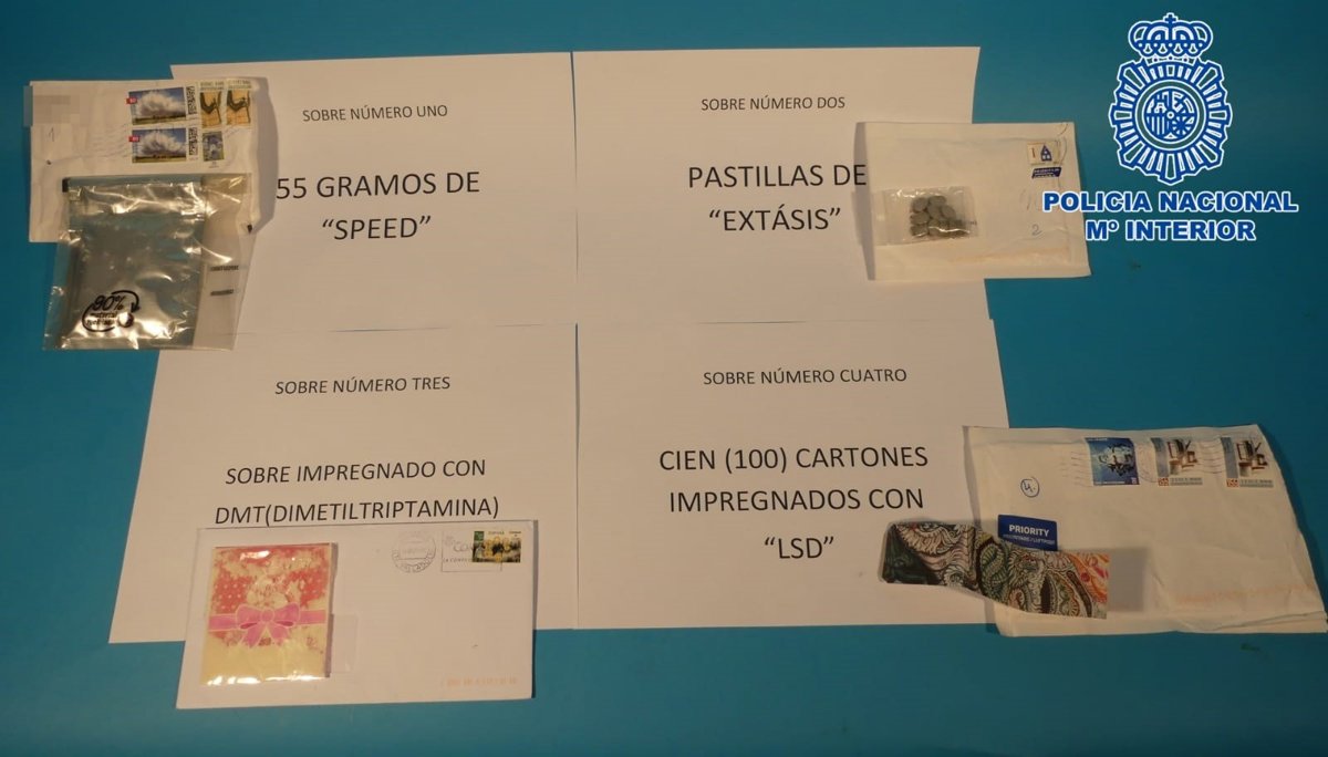 Además en los apartados de correos usados por el arrestado se le incautaron cuatro cartas que contenía 55 gramos de metanfetamina, 10 pastillas de éxtasis, dos gramos de Dimetiltriptamina y 100 dosis de LSD.