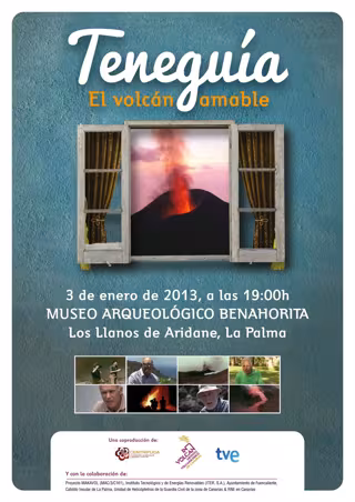 El Museo Arqueológico Benahoarita de Los Llanos de Aridane (La Palma) acoge mañana jueves a las 19.00 horas el acto de presentación del documental 'Teneguía, el volcán amable', un nuevo trabajo de Centrifuga Producciones coproducido por el Instituto Volcanológico de Canarias (Involcan) y Televisión Española (TVE).