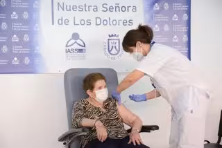 Doria Anatolia Ramos, de 84 años, ha sido la primera persona vacunada contra la COVID-19 en Canarias en el Hospital Nuestra Señora de los Dolores, en el municipio de La Laguna, en Tenerife.