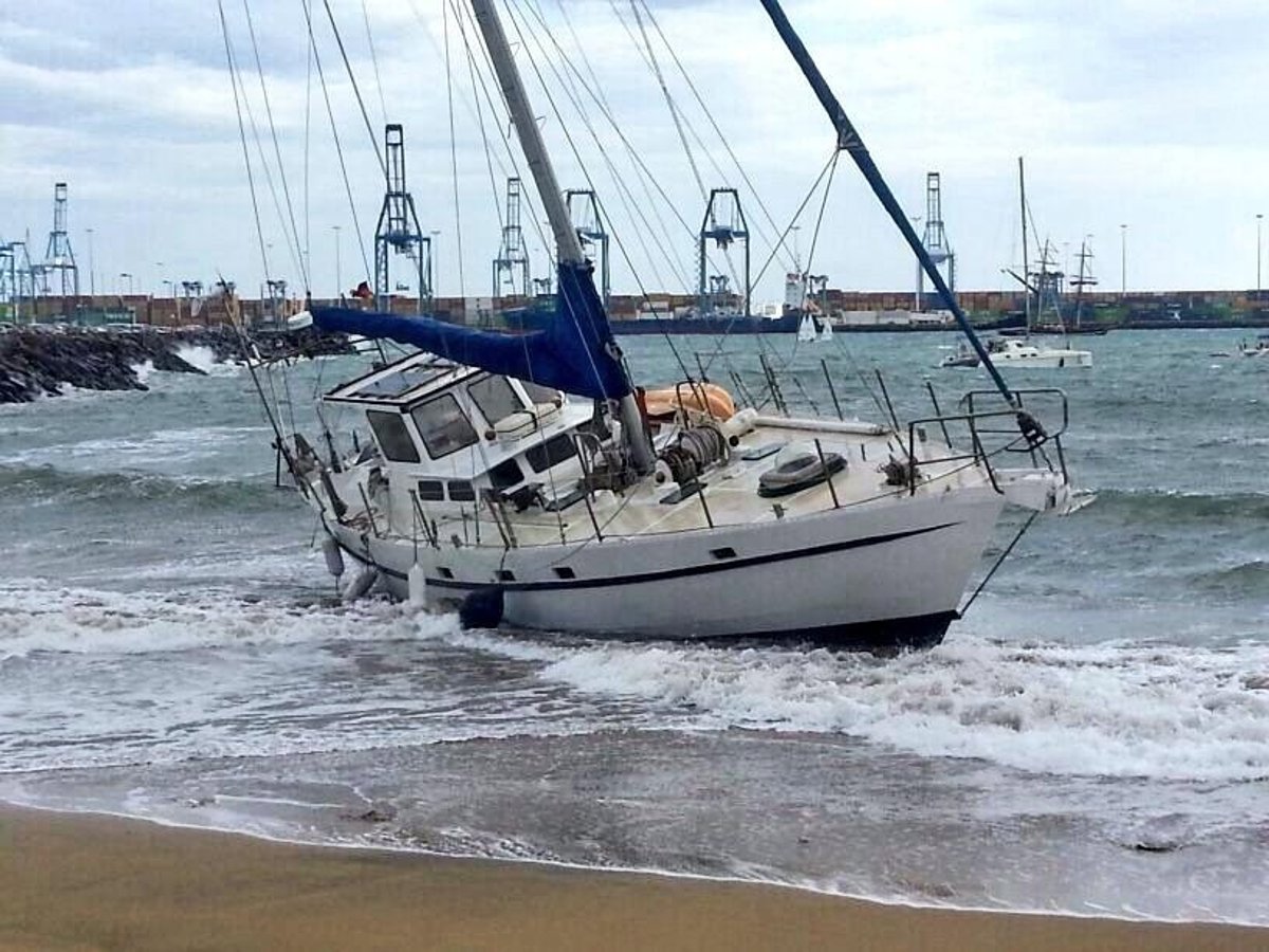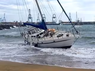 Un velero ha encallado en la mañana de este martes en la playa de las Alcaravaneras, en Las Palmas de Gran Canaria, debido al estado de la mar.