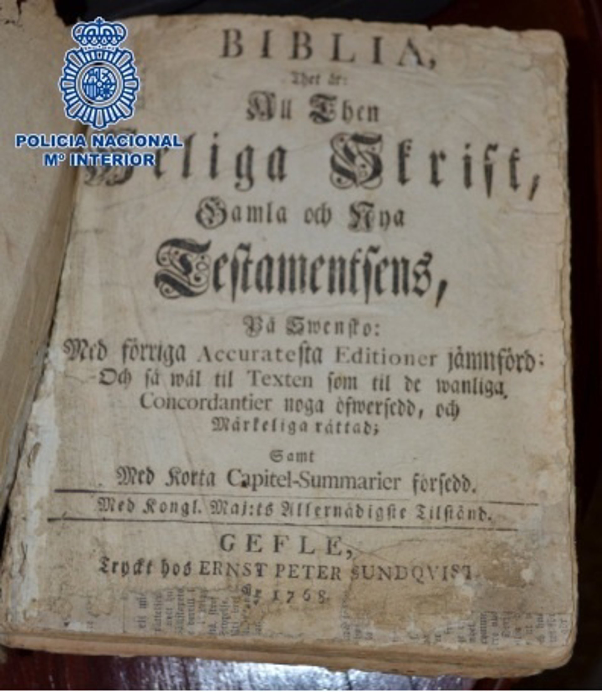 Una operación conjunta de la Policía Nacional con la policía sueca, alemana y las autoridades danesas ha permitido la incautación en Tenerife de medio centenar de obras de arte expoliadas en iglesias suecas, entre ellas, una biblia del siglo XVIII y cuatro tallas de madera del siglo XV de gran valor histórico.