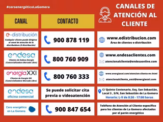 El Cabildo de La Gomera ha informado de los canales de atención para los afectados dispuestos por Endesa. Así, y tras la petición de la Institución insular y los ayuntamientos de establecer líneas específicas para los usuarios de la isla, la empresa suministradora ha dispuesto de un número de atención telefónica 900.847.654 y la puesta en servicio de una oficina en San Sebastián de La Gomera.