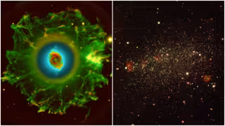 (Izquierda) Nebulosa Ojo De Gato, En Nuestra Galaxia. A La Distancia De La Galaxia De Andrómeda (Derecha), Mil Veces Más Lejana, Las Nebulosas Se Observan Como Puntos Verdes" - ROMANO CORRADI/IAC