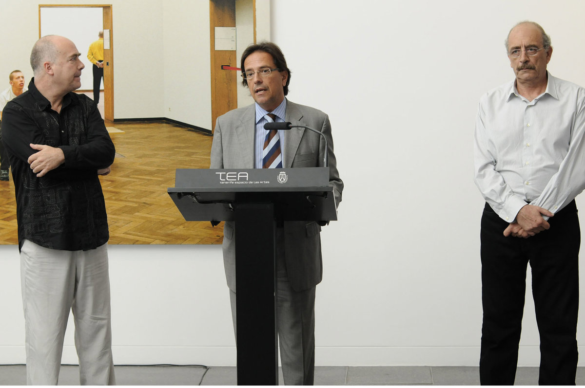 El coordinador general de Cultura y Patrimonio Histórico del Cabildo de Tenerife, Cristóbal de la Rosa; el director artístico de TEA, Javier González de Durana; y el director del Centro de Fotografía Isla de Tenerife, Antonio Vela, fueron los encargados de descubrir al público el entramado de 'El silencio de los objetos. Escenografías para el silencio'.