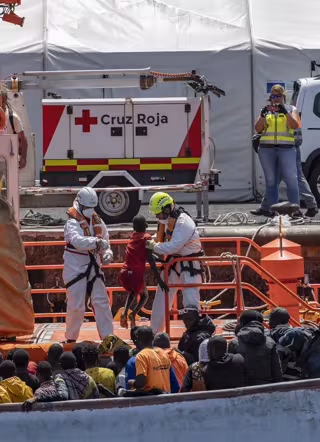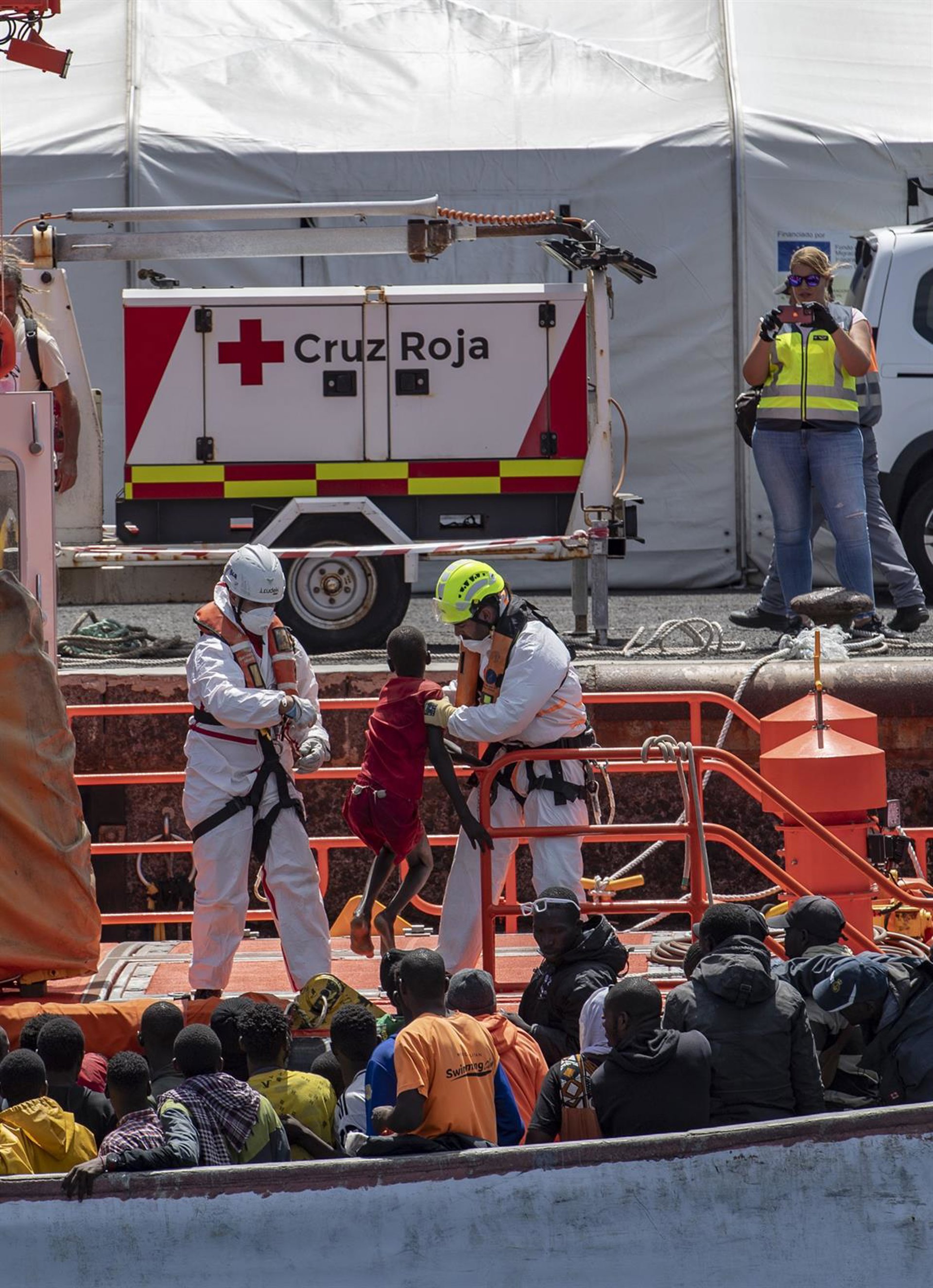 Miembros de los equipos de emergencias ayudan a desembarcar a varios migrantes de un cayuco, en el Puerto de La Restinga - Antonio Sempere - Europa Press
