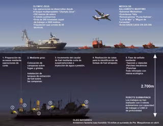 En estas "complejas" operaciones se han utilizado 3 ROV submarinos, capaces de trabajar a la profundidad en que se encuentra el pecio (2.700 m) y que han realizado la monitorización, así como el control de las operaciones desde el buque base de operaciones, el Olympic Zeus.