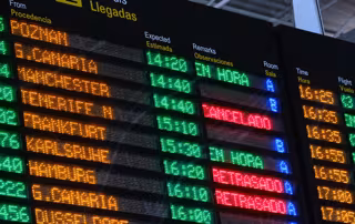 Archivo - Paneles luminosos con rótulos de vuelos cancelados o retrasados en el aeropuerto de Fuerteventura (Canarias), horas después de que la compañía británica de viajes Thomas Cook anunciase su quiebra, a 23 de septiembre de 2019 - Europa Press - Archivo