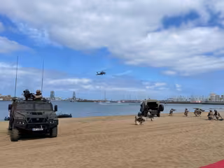 Posteriormente, Felipe VI se trasladó hasta la céntrica Playa de Las Alcaravaneras donde se ha desarrollado la exhibición dinámica con una demostración de las capacidades de los medios navales, aéreos, de Infantería de Marina y de desembarco por parte de la Armada.
