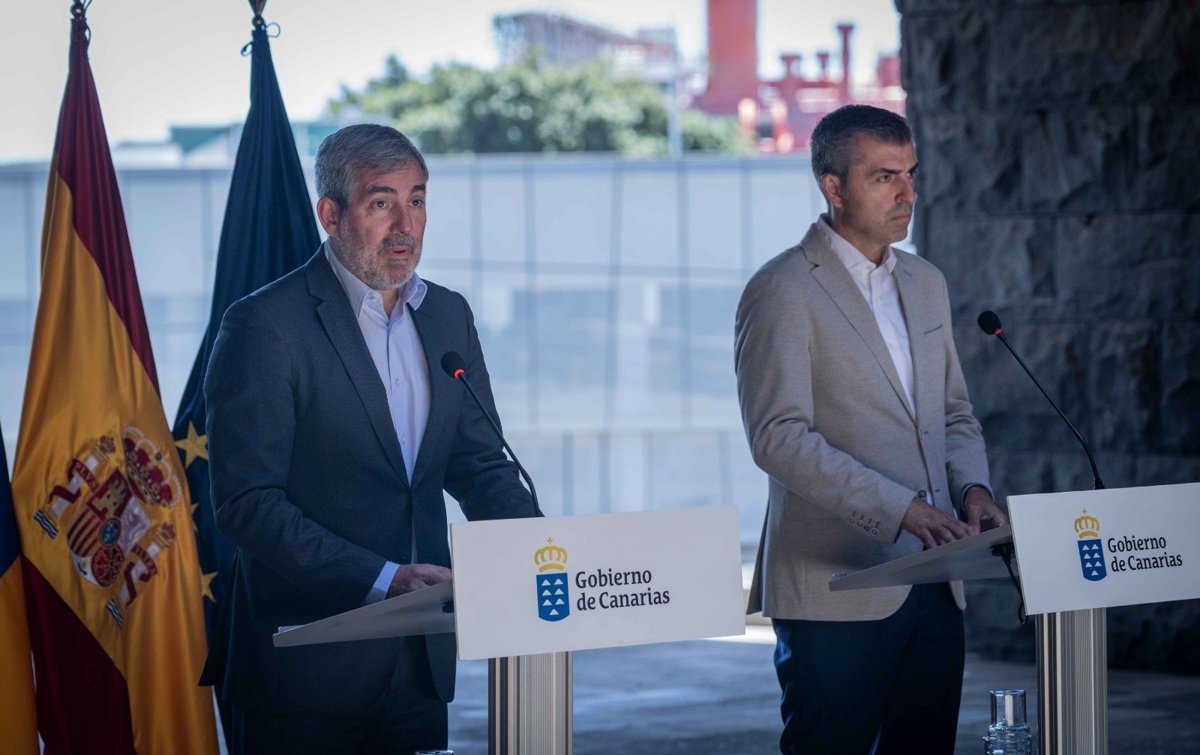 El presidente del Gobierno de Canarias y el vicepresidente, Fernando Clavijo y Manuel Domínguez, respectivamente, en la rueda de prensa posterior al primer Consejo de Gobierno - GOBIERNO DE CANARIAS