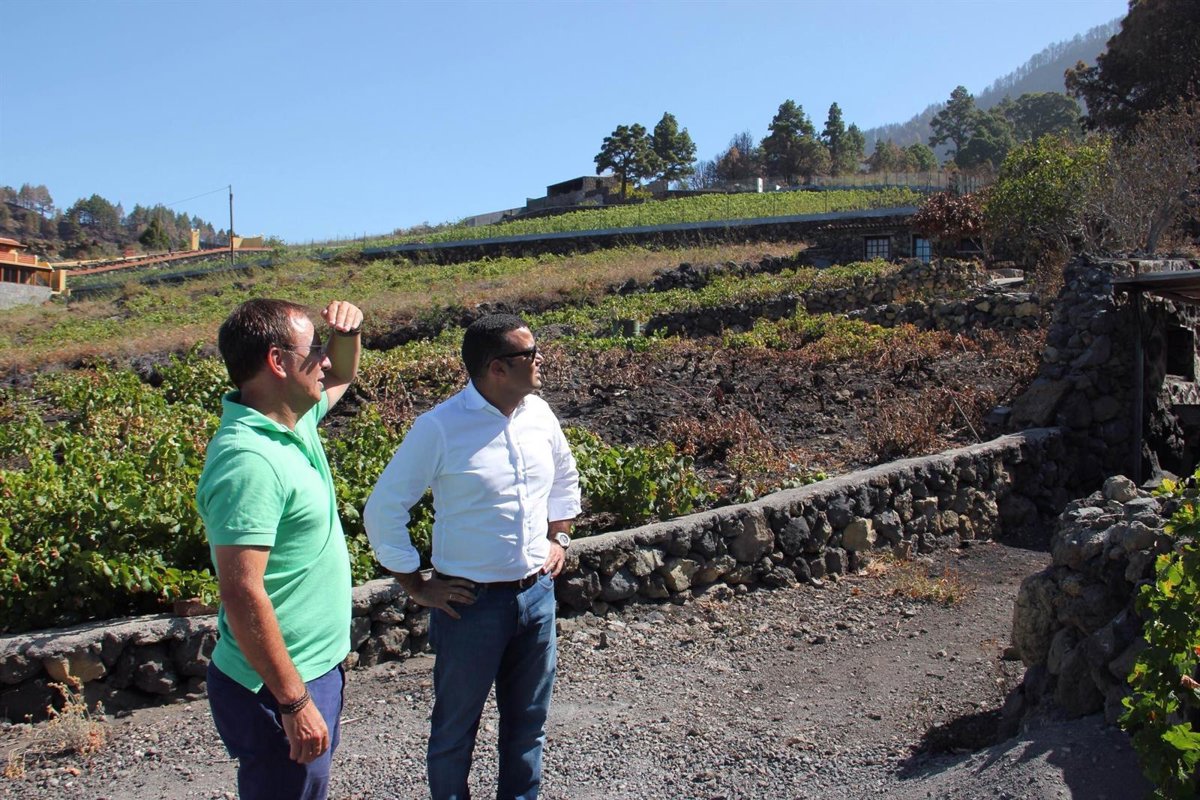 Durante la visita, ambos representantes del Gobierno canario se desplazaron a El Paso, acompañados por el alcalde del municipio, Sergio Rodríguez, donde recorrieron explotaciones de vid en Las Manchas que han sufrido las consecuencias del incendio.