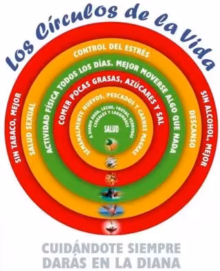 El primero de ellos, el más exterior está dedicado a tratar de prevenir el consumo de alcohol y tabaco; el siguiente está dedicado a la salud sexual, el control del estrés y el descanso; otro más interior tiene a la actividad física como motivo; otro a la alimentación, recomendando comer pocas grasas, azúcares y sal y comer semanalmente huevos, pescados y carnes magras, mientras que finalmente, en el centro, está beber a diario agua, leche, comer frutas, verduras, cereales y legumbres.