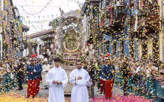 Una veintena de personas participan en esta iniciativa haciendo 'llover' desde las azoteas de dos casas este año unos 200.000 pétalos deshojados de varios miles de rosas.
