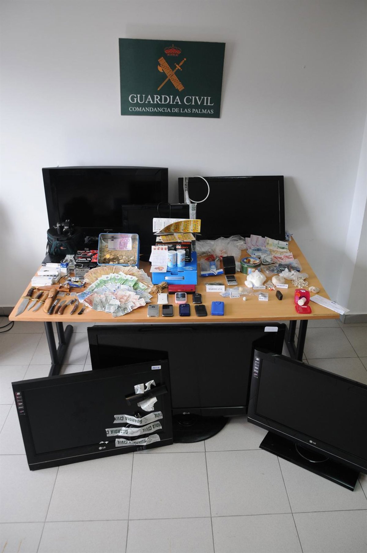 Como resultado de estos registro se aprehendió 2.172 dosis de heroína, 1.413 dosis cocaína y 30 gramos de crack; así como 540 gramos hachís, plantación de marihuana, sustancias para corte, unos 22.000 euros en efectivo y otros objetos.