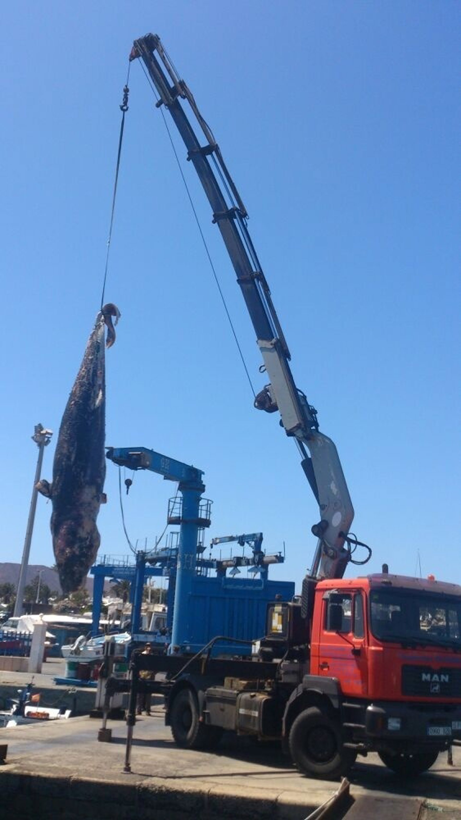 El animal fue retirado del puerto para su estudio por personal de la Sociedad para el Estudio de los Cetáceos en el archipiélago (SECAC).
