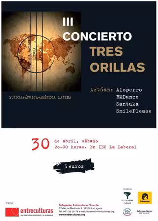 La delegación tinerfeña de Entreculturas organiza este sábado en La Laguna (Tenerife) la tercera edición del concierto 'Tres Orillas', que contará con la participación de los grupos Aloperro, BMDance, Santuka y SmilePlease. La cita tendrá lugar en el IES La Laboral a partir de las 20.00 horas y el objetivo de esta iniciativa es acercar al público más joven, a través del hecho musical, la realidad de continentes próximos como África y América.