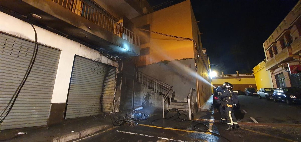 Las llamas afectaron, además, a la fachada de un edificio, a una puerta de garaje de uno de los locales y al tendido del suministro eléctrico de la calle. La moto quedó completamente calcinada.