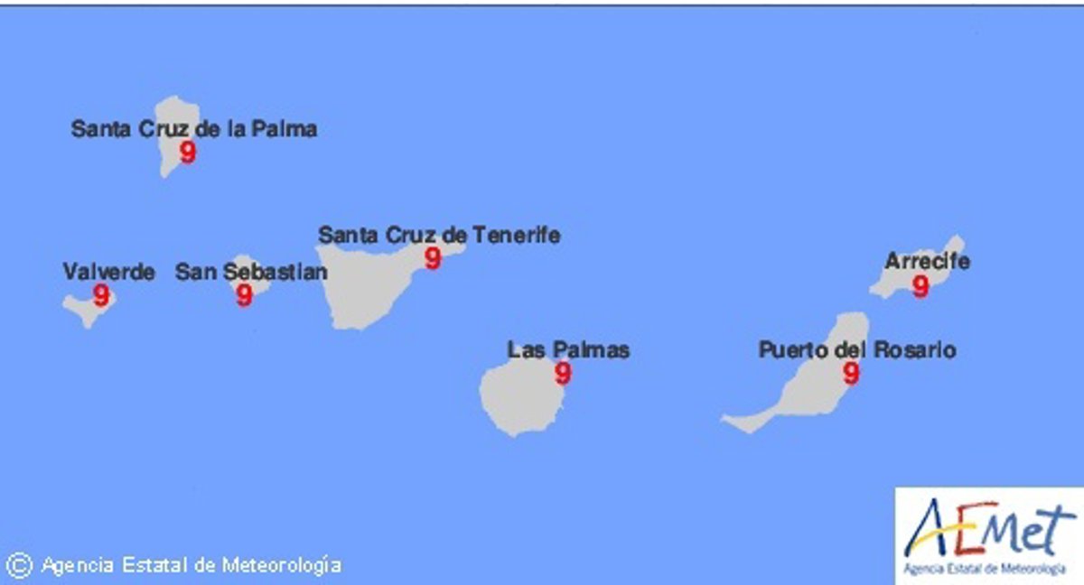 A lo largo de esta semana, el índice de radiación ultravioleta (UVI) en el archipiélago canario oscilará entre 8 y 9. En concreto, hoy lunes y mañana martes el índice será de 9 en todas las islas. El miércoles será de 9 en El Hierro, La Gomera y Gran Canaria, y de ocho en el resto; y el jueves y viernes el índice UV será de 8 en todas las islas