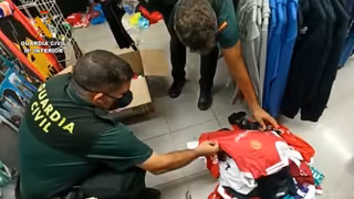 Agente de la Guardia Civil inspeccionando prendas supuestamente falsificadas - GUARDIA CIVIL