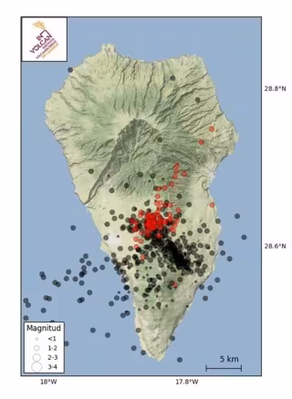 De los numerosos eventos sísmicos detectados, se han localizado 96 hasta las 17.59 horas de ayer domingo. Los hipocentros caen bajo la vertiente oeste del volcán de Cumbre Vieja a profundidades entre 15 y 20 km. La magnitud máxima observada ha sido de 1,8.