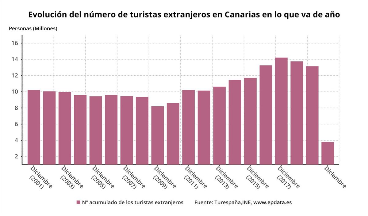 La llegada de turistas internacionales a Canarias se hundió un 71,19 por ciento en 2020, cuando solo llegaron al archipiélago 3,78 millones de visitantes, según los datos publicados este miércoles por el Instituto Nacional de Estadística (INE).