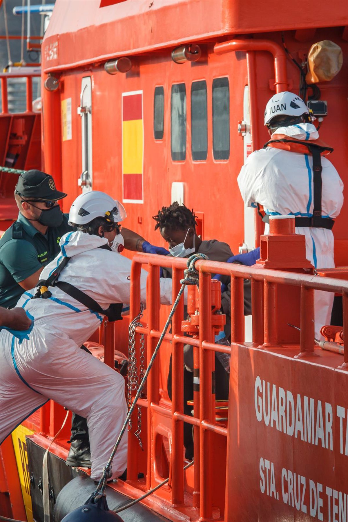 Archivo - Trabajadores ayudan a una mujer a salir de la embarcación 'Guardamar Talía tras el rescate de una patera en aguas canarias - Europa Press - Archivo