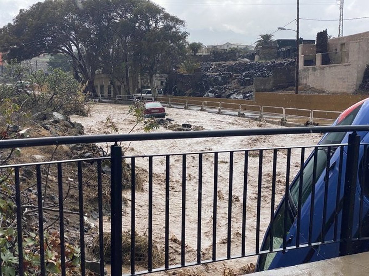 La lluvia que ha caído en la jornada de este lunes en la isla de Gran Canaria ha dejado cauces de barrancos desbordados y vehículos arrastrados por la corriente en el municipio de Telde.